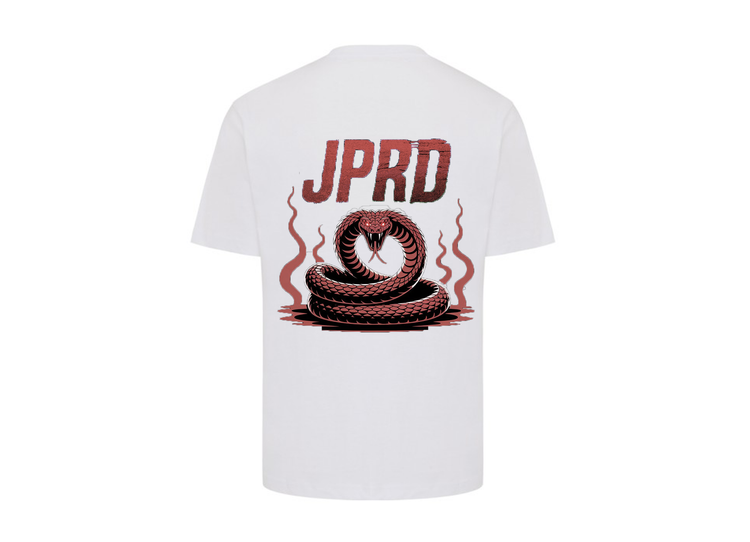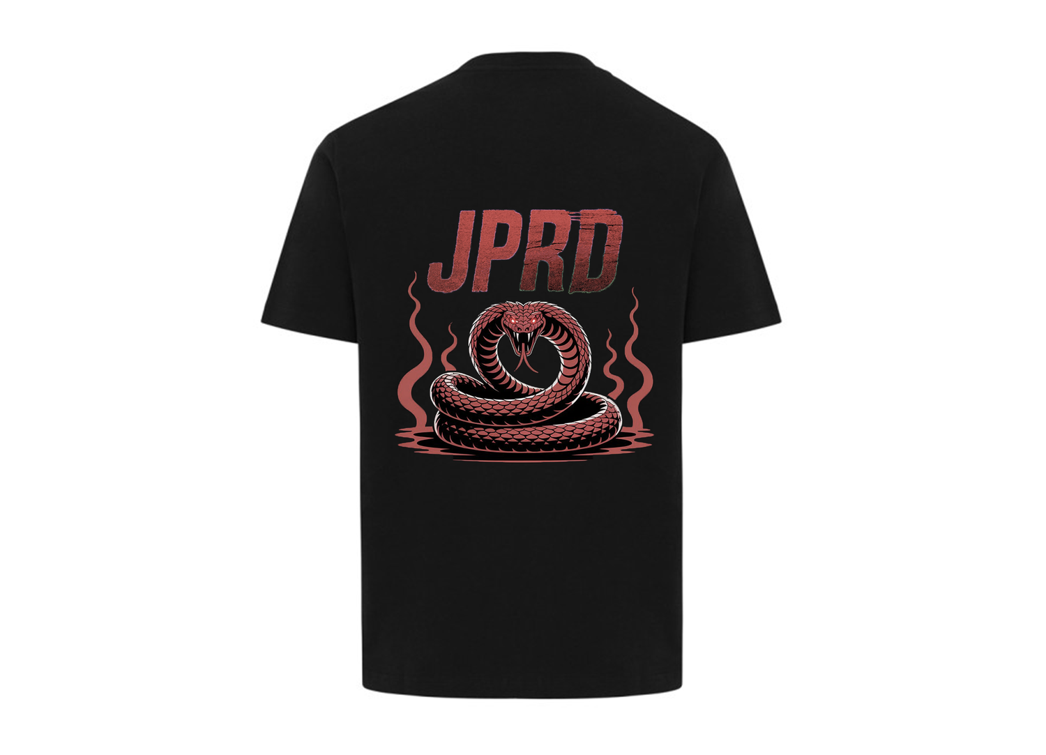 Sul retro della maglia domina un’iconica grafica urbana: il lettering JPRD emerge in caratteri consumati e corrosi, come se fosse stato inciso su un muro metropolitano tra rabbia e poesia. I colori, dal rosso scuro al nero bruciato, raccontano una tensione sotterranea, quasi viscerale.